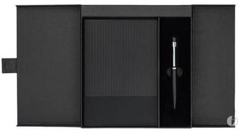 Solidus rinkinys, kurį sudaro A5 formato užrašų knygutė (80 lapų langeliais) su dirbtinės odos viršeliu bei metalinio tušinuku. Abu gaminiai stilingai liniuoti. Supakuota individualioje dovanų dėžutėje.