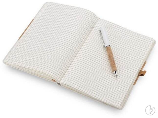 A5 formato užrašų knygutė (96 psl. lijinomis) su kamščio viršeliu. Komplekte tušinukas iš metalo ir kamščio. Supakuota popierinėje dėžutėje.