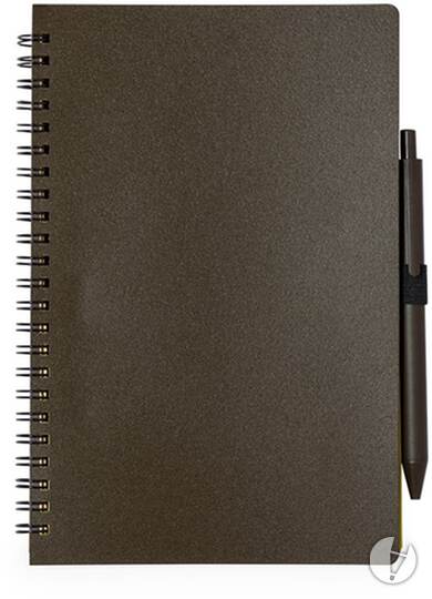 A5 formato užrašų knygutė su tušinukų, kurie pagaminti iš kavos pupelių plastiko (ne mažiau kaip 40% sudėties). Vidiniai užrašų knygutės lapai linijomis (70 lapų) pagaminti iš perdirbto popieriaus.