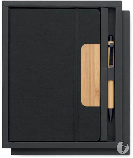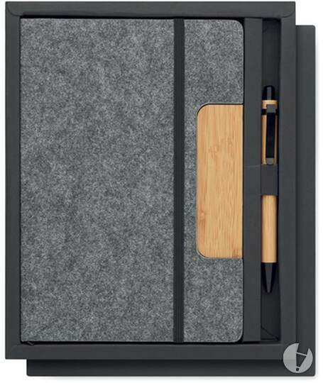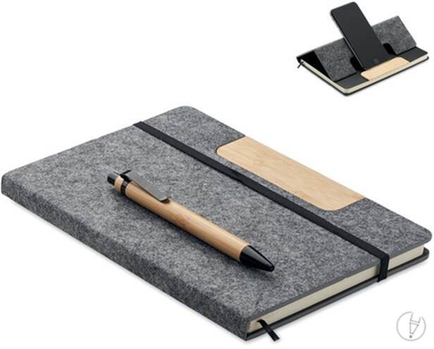 Kieto RPET veltinio viršelio, A5 formato užrašų knygutė (80 lapų linijomis) su bambuko apdailos detalėmis ir bambuko korpuso tušinuku. Užrašų knygutės viršelis integruojamas į stovelį telefonui. Supakuota juodoje džutėje.