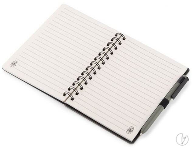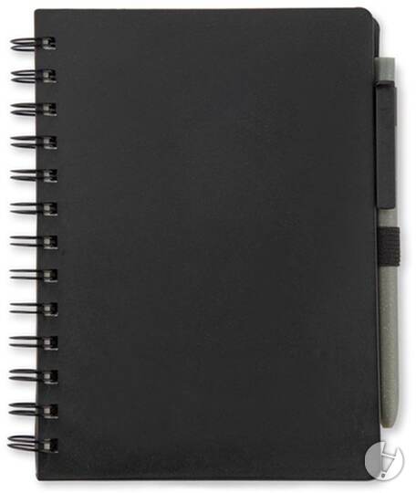 A5 formato bloknotas linijomis (70 lapų) su gumine juostele, pagamintas iš perdirbtų pieno pakuočių. Komplekte tušinukas iš perdirbto plastiko.